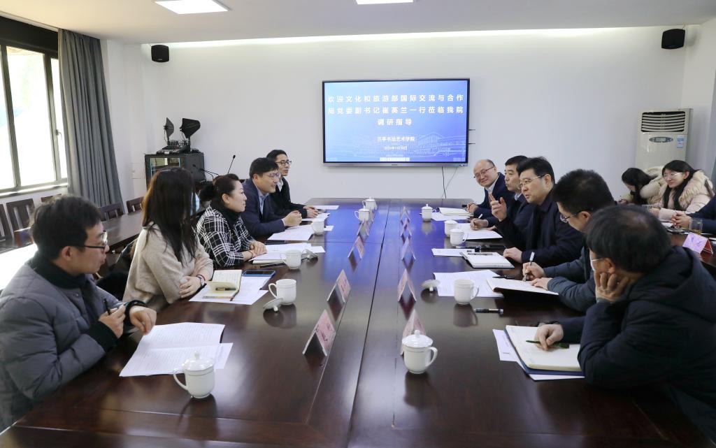 1月24日下午,文化和旅游部国际交流与合作局党委副书记崔英兰一行来我校兰亭书法艺术学院调研,校党委书记崔凤军,副校长陈均土,校党委委员、宣传部部长、办公室主任宋浩成和兰亭书法艺术学院党政班子成员陪同调研。崔凤军主持调研座谈会。