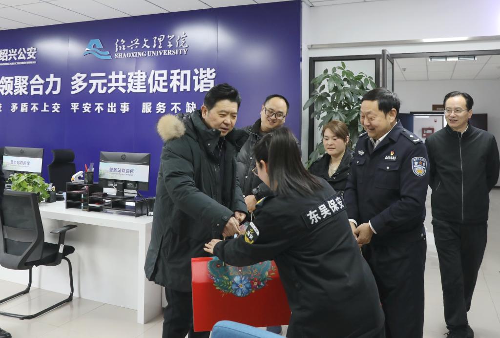崔凤军一行先后来到学校改扩建专班办公室、河西配电房、河东青藤书院、校警务站、学校正大门、附属医院、兰亭校区,亲切慰问了寒假期间依然坚守岗位认真履职的教职员工,致以诚挚的问候,并代表学校党委行政送上了新春祝福和慰问品。