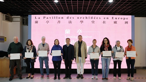 赵阳为瑞士“兰亭书法学堂”参展学员颁发收藏证书,并宣布展览开幕。