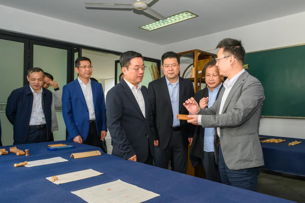 座谈会前,施惠芳一行走访了兰亭书法艺术学院展厅、“留青堂”竹雕工作坊、“兰亭书法学堂”标准化教室和教师工作室,观看师生作品展陈,了解学院人才培养和专业建设情况,并与教师们亲切交流。