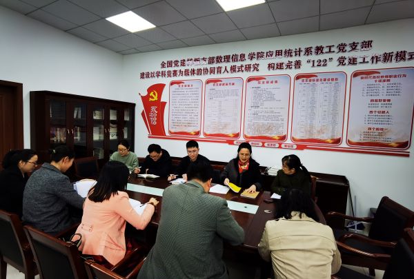 数理信息学院应用统计系教工党支部是第二批全国高校党建工作“样板支部”,现有党员12名,其中博士或高级职称10人、“双师双能型”教师10人,支部书记由学院党委委员蒋红云博士担任,支部全体党员均为学院教学、科研、管理骨干,是一支团结奋进、勇于创新、充满活力和战斗力的队伍。