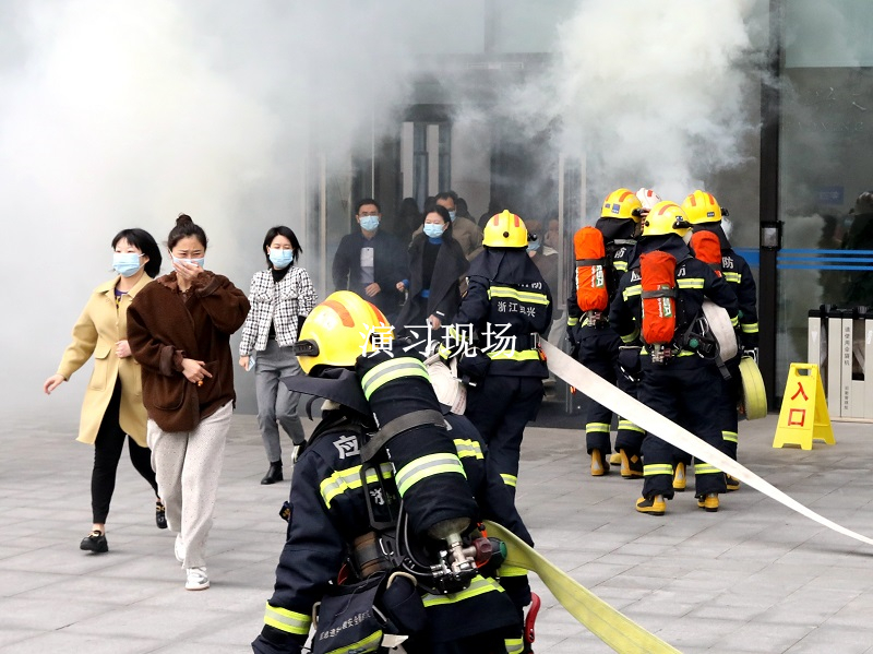 演习模拟了行政楼出现火情,启动一键报警装置报警,人员疏散,消防人员进行灭火和伤员救治的全过程。