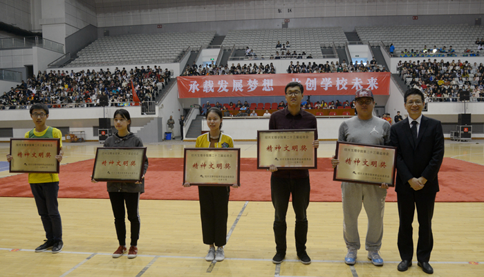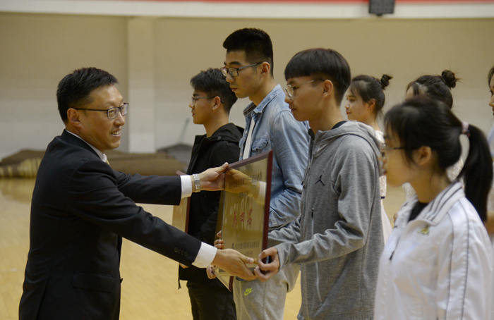 王建力为获得运动会精神文明奖的书院颁奖