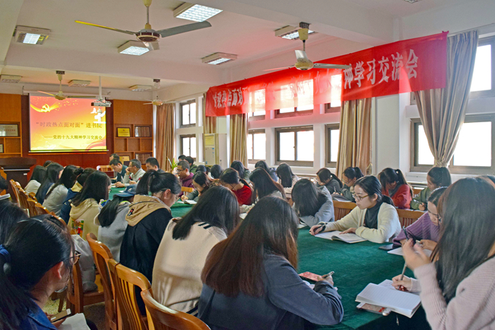 学习宣传贯彻党的十九大精神在校园内蔚然成风。10月19日上午,学校纪委召开纪委扩大会议,迅速传达学习党的十九大报告。10月20日下午,校党委副书记沈赤主持召开党群部门中层干部会议,认真学习党的十九大精神,部署下一阶段学习宣传工作。11月1日下午,校学工、工会系统各部门在图书馆报告厅举行专题学习会,校党委副书记唐和祥作专题报告;当天下午,学校民主党派、统战团体负责人和部分绍兴市政协委员共同学习党的十九大精神,沈赤作专题辅导。11月2日上午,离退休分党委举行了以“畅谈十九大学习心得”为主题的党日活动。