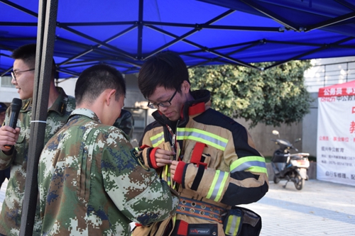当日下午,“文理携手消防 平安长驻校园” 倡议签名活动在建功书院公寓广场开展。绍兴市公安消防支队的官兵们为大家展示和讲解了各类消防器材设备的使用和发生在我们身边的大量火灾案例,吸引了大量师生驻足围观,同学们踊跃参与,亲身体验消防服,佩戴空气呼吸器以及防毒面具,聆听消防官兵讲述日常预防火灾知识。