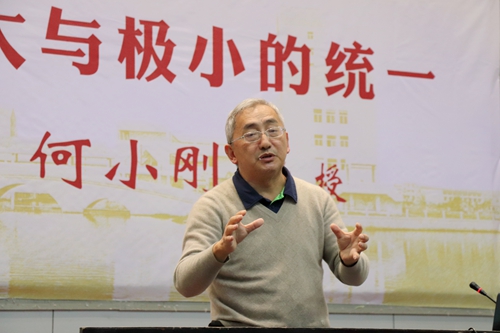 何小刚教授从极小(粒子)及其相关的发现史出发,指出现今接受的最小粒子夸克和粒子的标准模型――强和弱电作用力的标准模型。他强调,在研究基本粒子和他们的相互作用时,需要不断用实验去佐证,需要不断更新现有的设备和理念。何小刚教授分别就强子、轻子、光子等粒子的各自组成和相互之间的联系一一进行了分析和推导。何小刚教授指出,对这些粒子的发现和了解并不是粒子物理的结束,“这仅仅是又一轮新的探索的开始!”
