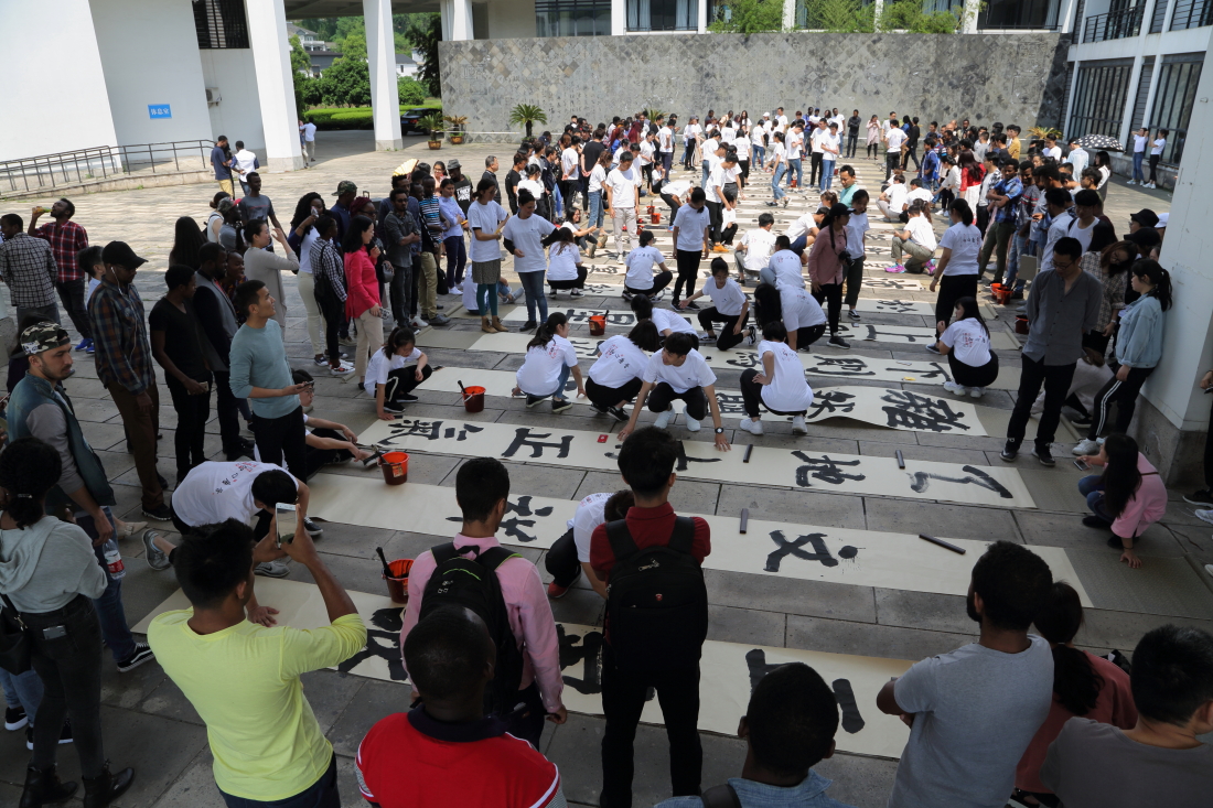 见面会之后,书法学院在照壁广场前举行了一年一度的“畅写阳春”活动,老师与学生们一起书写文天祥的《正气歌》。来自国际学院的150多名留学生参与此次活动。