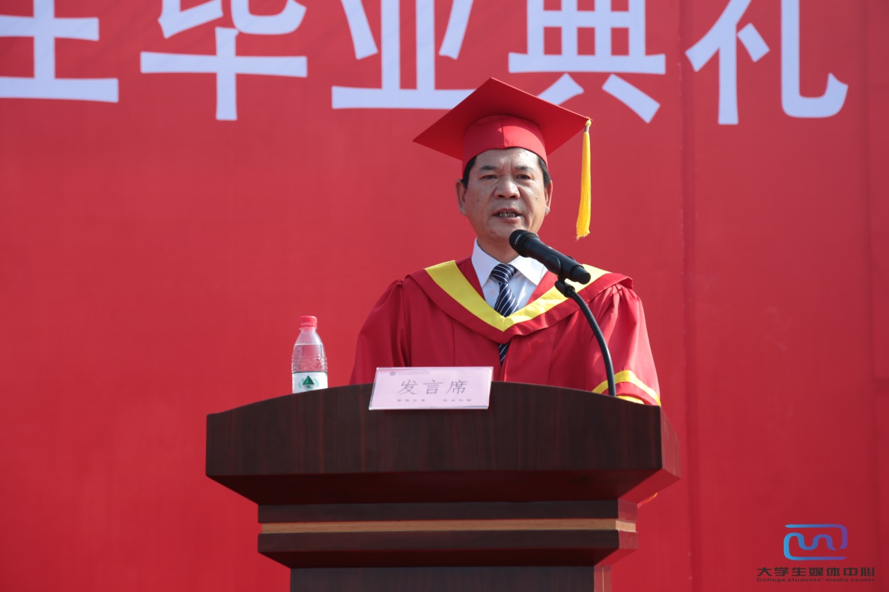 英语1401班钟栗等两位同学作为毕业生代表发言,她表达了对母校四年培养的感激之情,表示今后无论身在何方,身处何位,将不忘恩师教导,脚踏实地、学以致用、用以促学、学用相长。