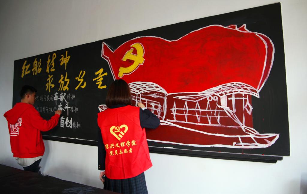 此外,新生党员结合学校校庆日和校友活动,对宋六陵校址教室的黑板进行美化,设计具有时代特点和党建氛围的主题版画,为老校址建设奉献了力量。
