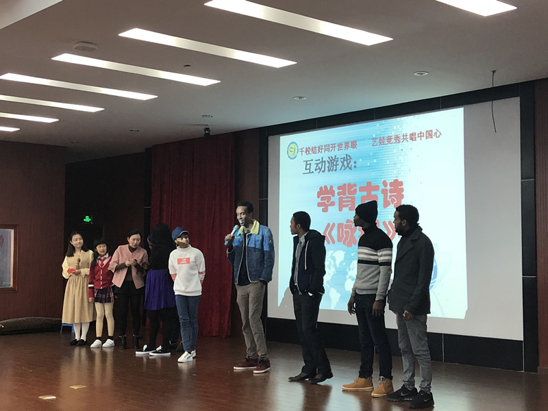 国际学生在少儿艺校欣赏了武术操表演、葫芦丝吹奏、民族舞表演等,还穿插了“丢手绢”和背诵《咏鹅》等互动游戏,现场气氛热烈。