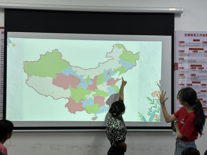 在推普课堂上,“山海同声”实践团以“推普”为帆,以国家通用语言文字为桨,带着孩子们与经典诗词邂逅——团队成员逐字逐句朗诵示范,让韵律随着标准发音钻进孩子们耳朵;再把诗词融入旋律,让意蕴借歌声在教室里流淌,沁入孩子们心田。孩子们从生疏跟读,到熟练朗诵、欢快诵唱,普通话成为传递经典的桥梁,让梅花的坚韧、竹石的风骨在稚嫩童声里扎根。成员们还带领孩子们开启奇妙的省份探索之旅,无论是边疆的异域风情,还是内陆的厚重历史,一幅多民族融合盛景伴随着普通话在同学们眼前徐徐展开。这堂省份认知课,借普通话推广,把民族共同体意识播撒进了孩子心田。